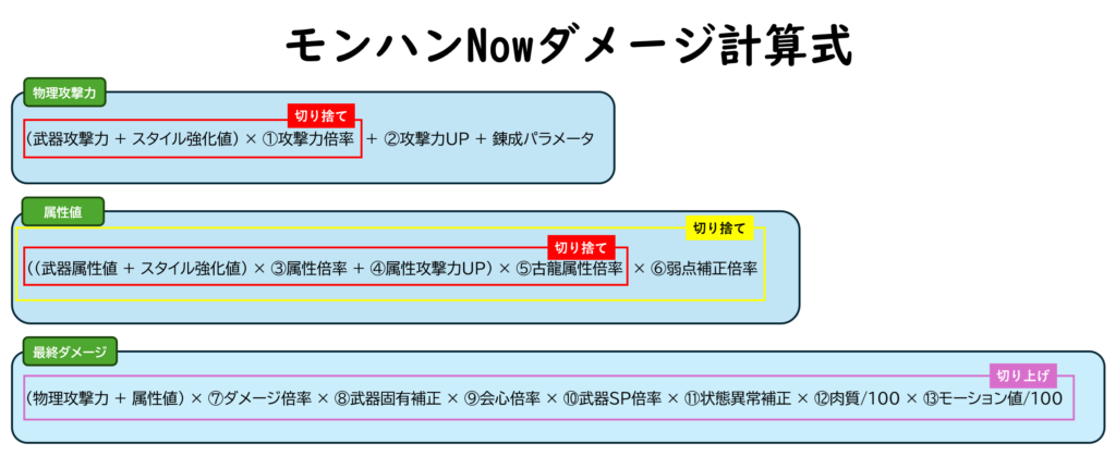 ( 物理攻撃力 + 属性値 ) × ダメージ倍率 × 会心倍率