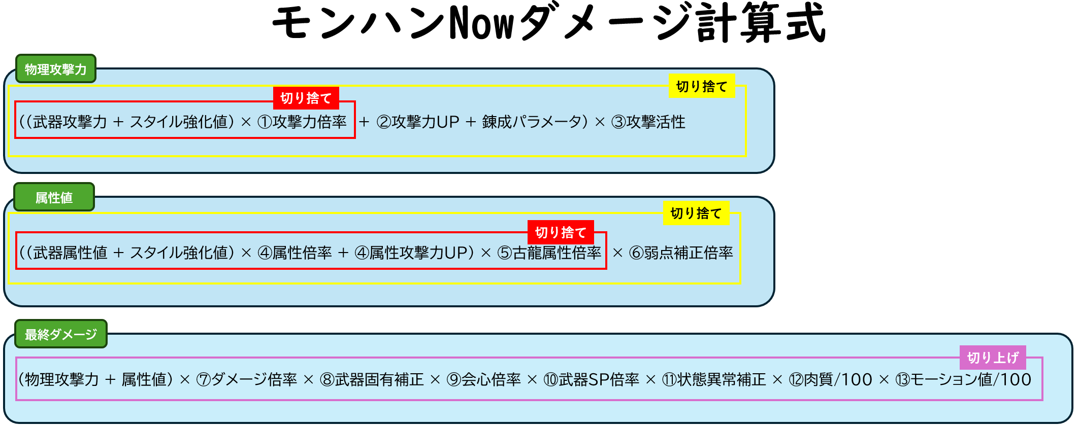 ( 物理攻撃力 + 属性値 ) × ダメージ倍率 × 会心倍率