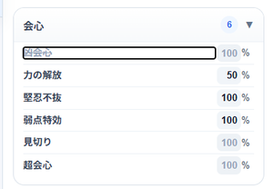 装備構成(エディタ)と異なり、必ず発動するスキルも表示されていますが、そのスキル発動率は設定出来ないようになっています。
