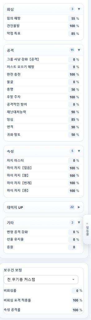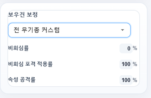 「전 무기종 커스텀」을 선택하면 아래 값을 자유롭게 설정할 수 있습니다.