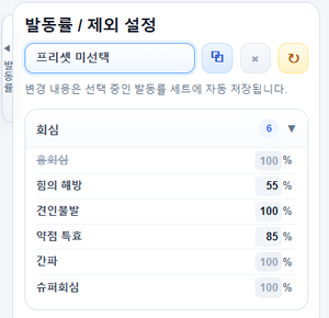장비 구성(에디터)과 동일하게 발동률 설정이나 프리셋 선택을 할 수 있습니다. (자세한 내용은 장비 구성 참고)